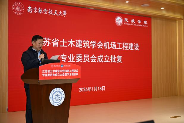 1月18日,江苏省土木建筑学会机场工程建设专委会(以下简称专委会)成立大会暨学术报告会顺利举行。本次会议由江苏省土木建筑学会主办,南京航空航天大学民航学院承办,江苏沃叶软件有限公司协办。江苏省土木建筑学会副理事长王华、秘书长卢红标、办公室主任蒋亮艳等学会领导,民航机场规划设计研究总院总工程师、全国勘察设计大师姜昌山,中国民航科学技术研究院机场研究所所长万健等行业专家,南京航空航天大学科协秘书长冯绍红、民航学院院长张卓然以及60多位专委会委员参加活动。