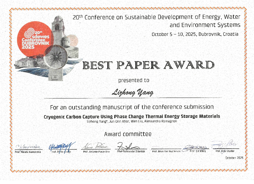10月5日至10日,第二十届能源、水和环境系统可持续发展大会(Conference on Sustainable Development of Energy, Water and Environment Systems,SDEWES)在克罗地亚杜布罗夫尼克召开,国家级青年人才、民航学院杨立中副研究员等人发表的题为《基于相变储冷材料的超低温碳捕集技术》(《Cryogenic Carbon Capture Using Phase Change Thermal Energy Storage Materials》)论文荣获最佳论文奖。